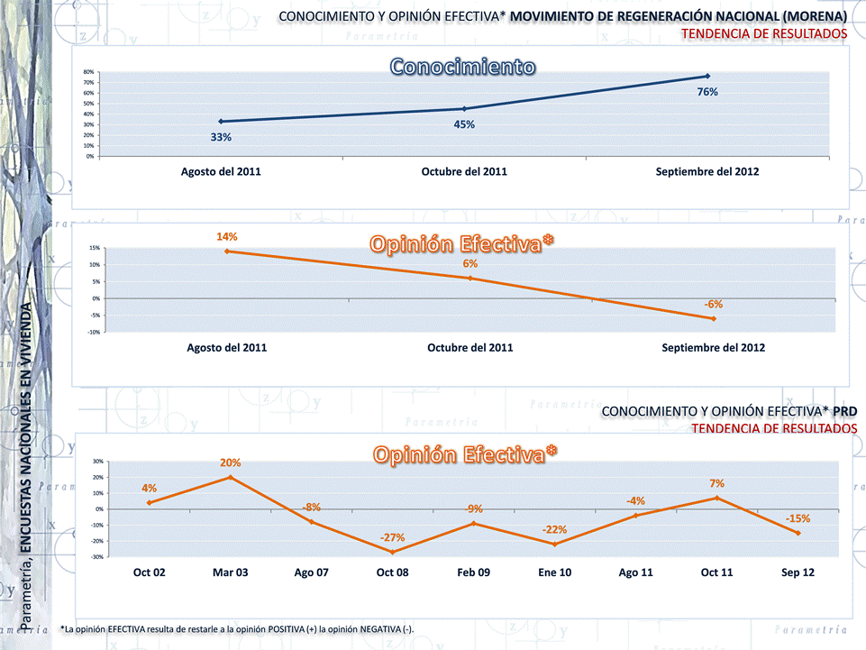 De acuerdo con la encuesta en vivienda realizada por Parametría en septiembre de 2012, Morena es conocido por ocho de cada diez mexicanos. Su opinión efectiva (resta de la opinión positiva menos la negativa) ha ido en descenso desde agosto de 2011, de 14%, a -6%.