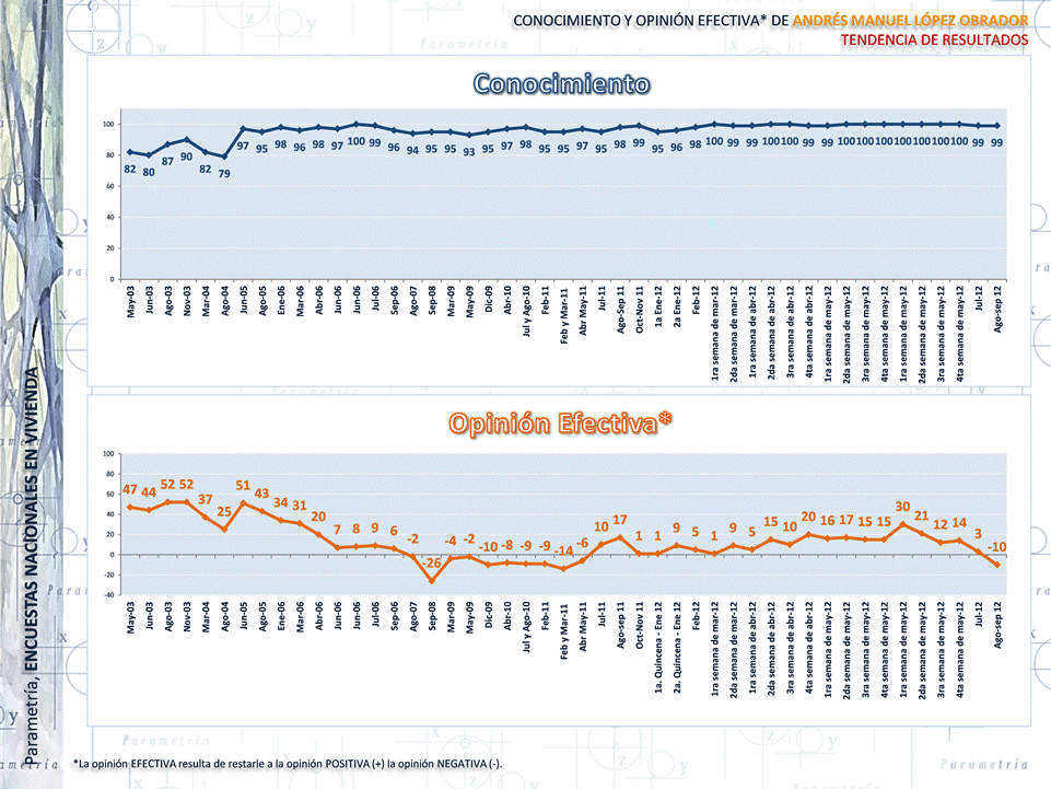 PARAMETRÍA. Encuesta Nacional en vivienda. Representatividad: Nacional. Número de entrevistas: 500 encuestas del 22 al 26 de septiembre de 2012. Nivel de confianza estadística: 95%. Margen de error: (+/-) 4.4%. Diseño, muestreo, operativo de campo y análisis: Parametría SA de CV. Método de muestreo: Aleatorio sistemático con probabilidad proporcional al tamaño. Unidad de muestreo: Las secciones electorales reportadas por el IFE.