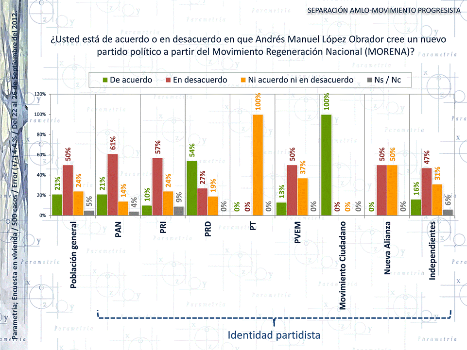 Tal vez el dato más sobresaliente es el que el 47% de los ciudadanos sin identificación partidista refirieron estar en desacuerdo con la creación del partido, el 31% no tomó postura en el tema, y sólo 16% estuvo de acuerdo con que se creara un nuevo partido político a partir del Movimiento Regeneración Nacional.