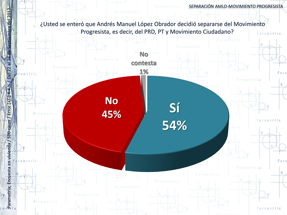 La separación de Andrés Manuel con Movimiento Progresista -integrado por los partidos PRD, PT y Movimiento Ciudadano- efectuada en septiembre de este año fue conocida por el 54% de los entrevistados.