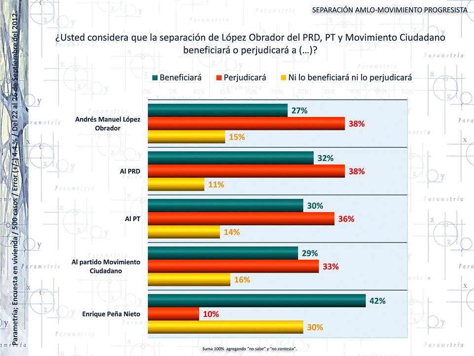 Sobre quién sería el más beneficiado con esta separación, el 42% de los entrevistados señaló que sería Enrique Peña Nieto, y en cuanto a los perjudicados con la decisión, el 38% nombró al propio Andrés Manuel y al PRD.