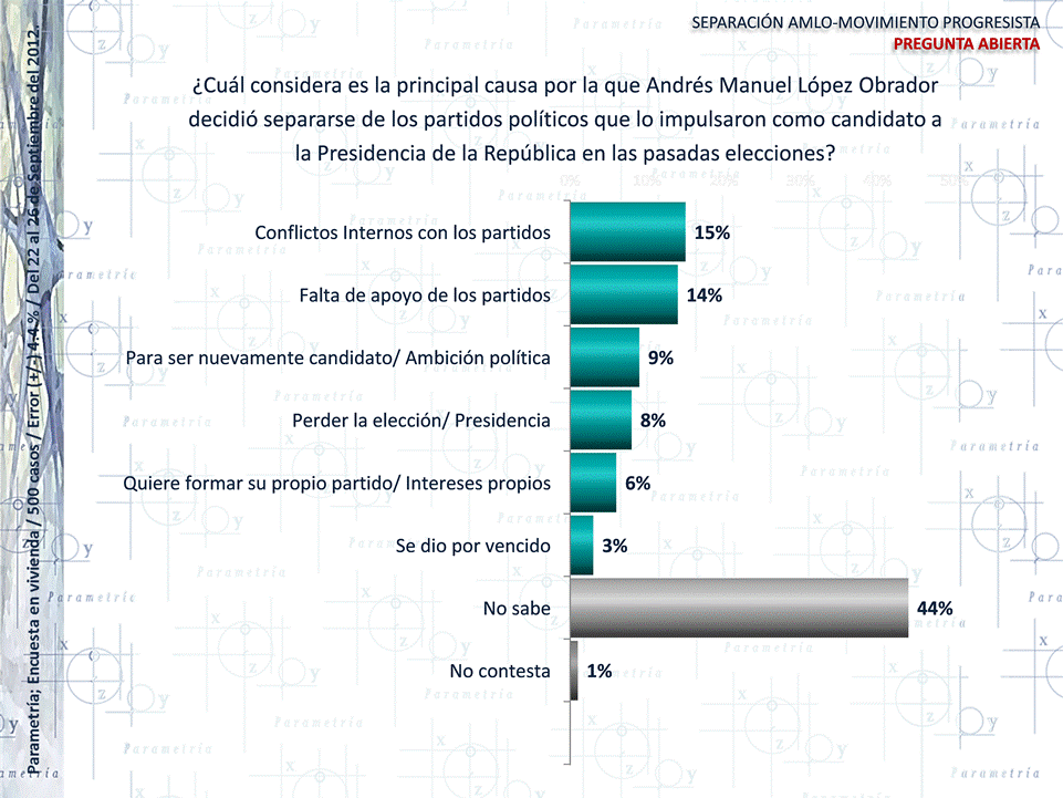 De acuerdo con el ejercicio, el 44% de las personas desconoce las causas por las cuales AMLO decidió separarse del Movimiento Progresista, para el 15% la razón de la separación fueron los conflictos internos con los partidos políticos; el 14% opina que la fractura se dio por la falta de apoyo de los partidos, el 9% de los entrevistados cree que por ambición política, y el 8% supone que por perder la elección presidencial.