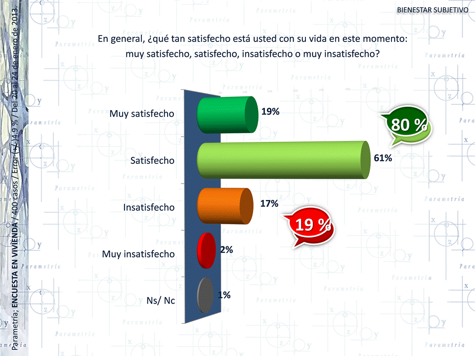 En el caso de México, de acuerdo con la encuesta nacional en vivienda realizada por Parametría en enero de 2013, 80 % de los entrevistados manifestó estar satisfecho o muy satisfecho con su vida, contra 19 % que dijo estar insatisfecho, dato que indica que existe un importante número de mexicanos que perciben un bienestar subjetivo en su forma de vida.