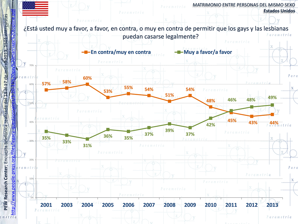 PEW RESEARCH CENTER“Gay Marriage: Key Data Points from Pew Research” Encuesta telefónica realizada del 13 al 17 de marzo 2013, 1501 entrevistas. Fecha de consulta 01 de abril de 2013 http://www.pewresearch.org/2013/03/21/gay-marriage-key-data-points-from-pew-research/