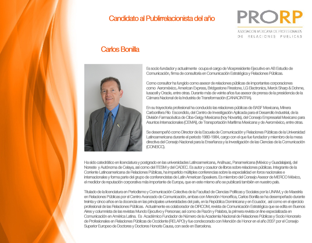 Nos dará mucho gusto contar con tu presencia el martes 11 de junio a partir de las 18:30 en el PR Tuesday para que al finalizar la conferencia de ese día podamos hacer la ceremonia de entrega del reconocimiento al publirrelacionista del año por tu exitosa trayectoria: CARLOS BONILLA GUTIÉRREZ.