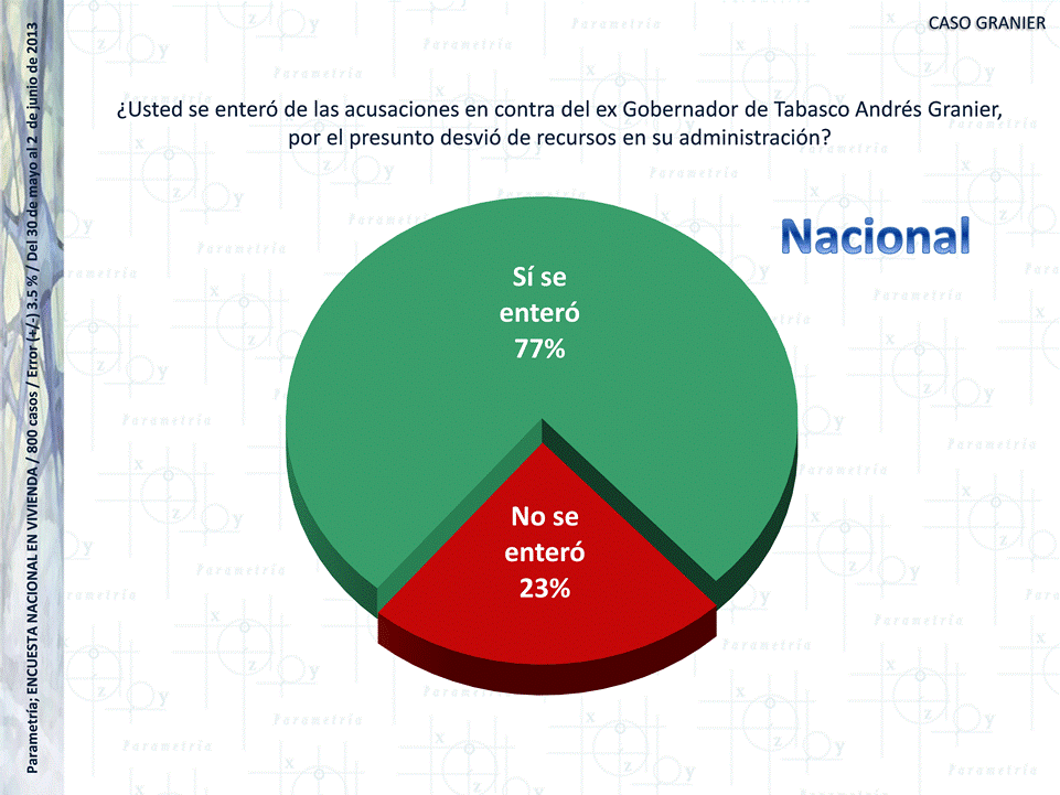 Las opiniones recabadas en la más reciente encuesta nacional en vivienda de Parametría, muestran el interés que los mexicanos tienen sobre el presunto desvío de recursos que ex funcionarios realizaron en el estado de Tabasco. Ocho de cada diez entrevistados a nivel nacional (77 %) afirmaron estar al tanto de las denuncias que acusan a Andrés Granier del desfalco financiero en la entidad.