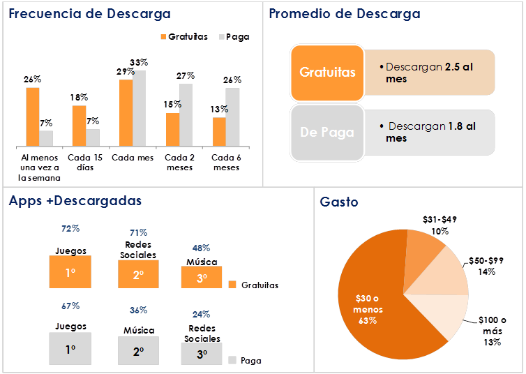 La intensidad de descarga de aplicaciones también difiere entre aquellas de paga y gratuitas, en el caso de las gratuitas contabilizan 2.5 descargas promedio al mes, en contraste con 1.8 descargas mensuales en las de paga, de difícil adquisición si no se cuentan con los medios para su obtención. En general, las formas de facturación para la obtención de aplicaciones condicionan al usuario a la tenencia de tarjetas de crédito o débito, y en su ausencia a la compra de tarjetas prepagadas de las tiendas de descarga, lo cual limita la adquisición de apps de paga.
