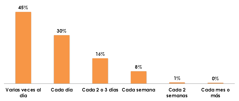Ante esto, los internautas más intensivos de las redes sociales, que corresponden a un 45% del total, ingresan varias veces al día, mientras que 1 de cada 3 acceden al portal de su red preferida con una frecuencia diaria. Cabe mencionar que los primeros mantienen una conexión ininterrumpida a sus redes debido al desarrollo de aplicaciones móviles, que aunado a la capacidad de transmisión de datos de forma inalámbrica, facilita el ingreso de los usuarios.
