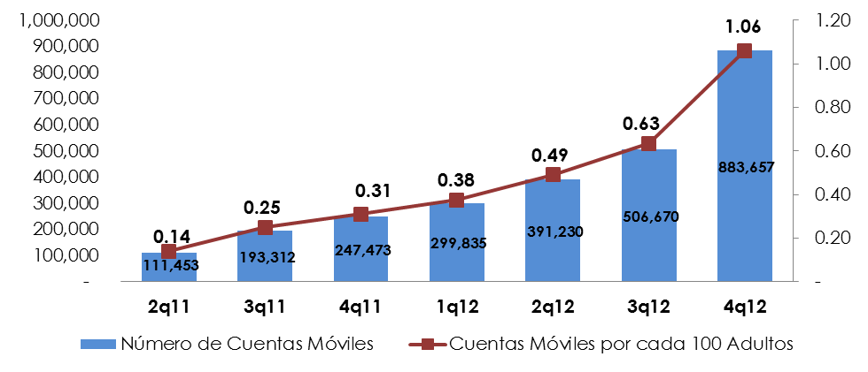 En México, el uso de servicios financieros a través de la red ha venido creciendo durante los últimos años. De acuerdo el Quinto Reporte de Inclusión Financiero elaborado por la Comisión Nacional Bancaria y de Valores (CNVB), en México, hacia finales de 2012, los servicios de Banca Móvil eran usados por 1.06 de cada cien mexicanos, pues existían 883 mil cuentas bancarias vinculadas a una terminal de telefonía móvil. De hecho, este mismo estudio reveló que el número de usuarios de Banca Móvil incrementó 241.9% durante 2012.