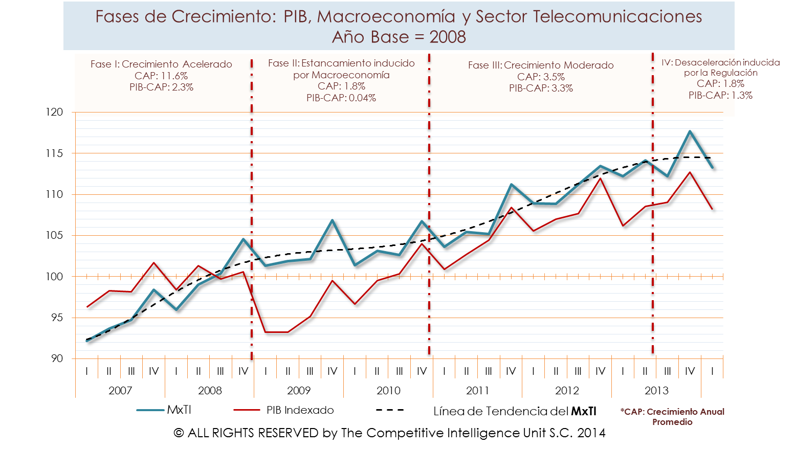 En su actual fase, la tendencia del indicador nos permite identificar una desaceleración y estancamiento de las telecomunicaciones mexicanas en los últimos tres periodos de análisis, a partir del tercer trimestre del año pasado, hasta el desempeño del primer trimestre de 2014.
