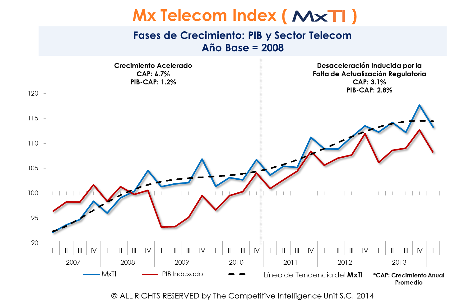 En este espacio, la semana pasada, se presentó una fotografía de largo plazo de la evolución del sector de las telecomunicaciones en México, con base en el Indicador Líder Telecom (Mx Telecom Index, MxTI). MxTI consolida la información de las principales variables de operación del sector para cuantificar el desempeño sectorial y su evolución con relación a los ciclos económicos, condiciones tecnológicas y de mercado, regulación existente y preferencias de los consumidores.