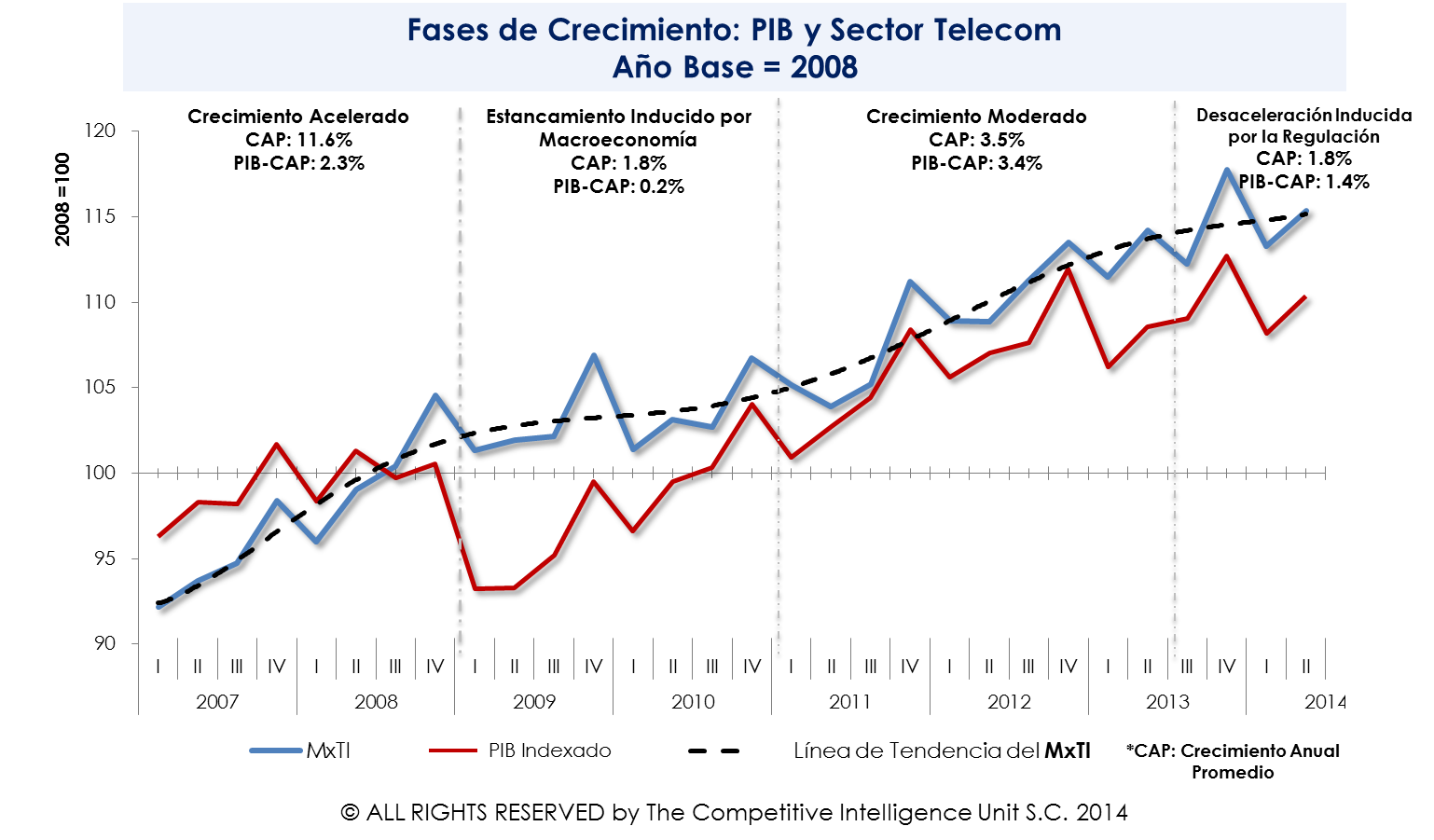 En su actual fase, la tendencia del indicador nos permite identificar una desaceleración y estancamiento de las telecomunicaciones mexicanas en el último año de análisis, a partir del tercer trimestre del año pasado, hasta el desempeño del segundo trimestre de 2014.