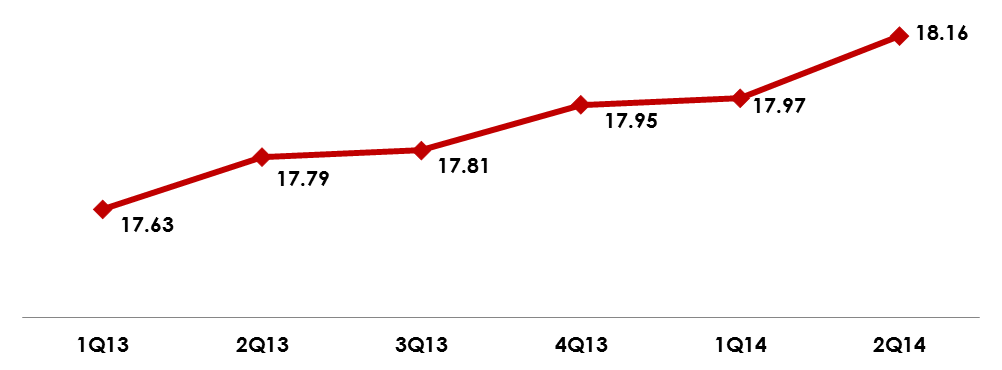 Como se puede observar en la gráfica anterior, desde inicios de 2013 la duración promedio de los planes de pospago que ofrecen los operadores, ha aumentado de 17.63 a 18.16 meses. Podemos esperar que en los próximos periodos esta tendencia continúe en crecimiento hasta situarse en una cifra intermedia entre los 18 y 24 meses en promedio. A su vez, la mayor duración de los planes en pospago ha dado pie al crecimiento del periodo de sustitución de equipos por parte de los usuarios. Es decir, existe una tendencia al alza en la cantidad de meses que las personas permanecen con sus teléfonos móviles, ya que éstas tienden a renovar los dispositivos al término de sus planes o contratos.