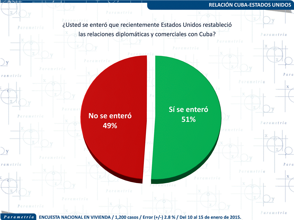 La noticia sobre esta nueva etapa en la relación del país vecino con Cuba, trascendió en la mitad de los mexicanos. De acuerdo con la última encuesta en vivienda realizada por Parametría, el 51 % de los entrevistados se enteró que ambos países reestablecieron relaciones comerciales y diplomáticas, dando fin a la enemistad que duró poco más de medio siglo.