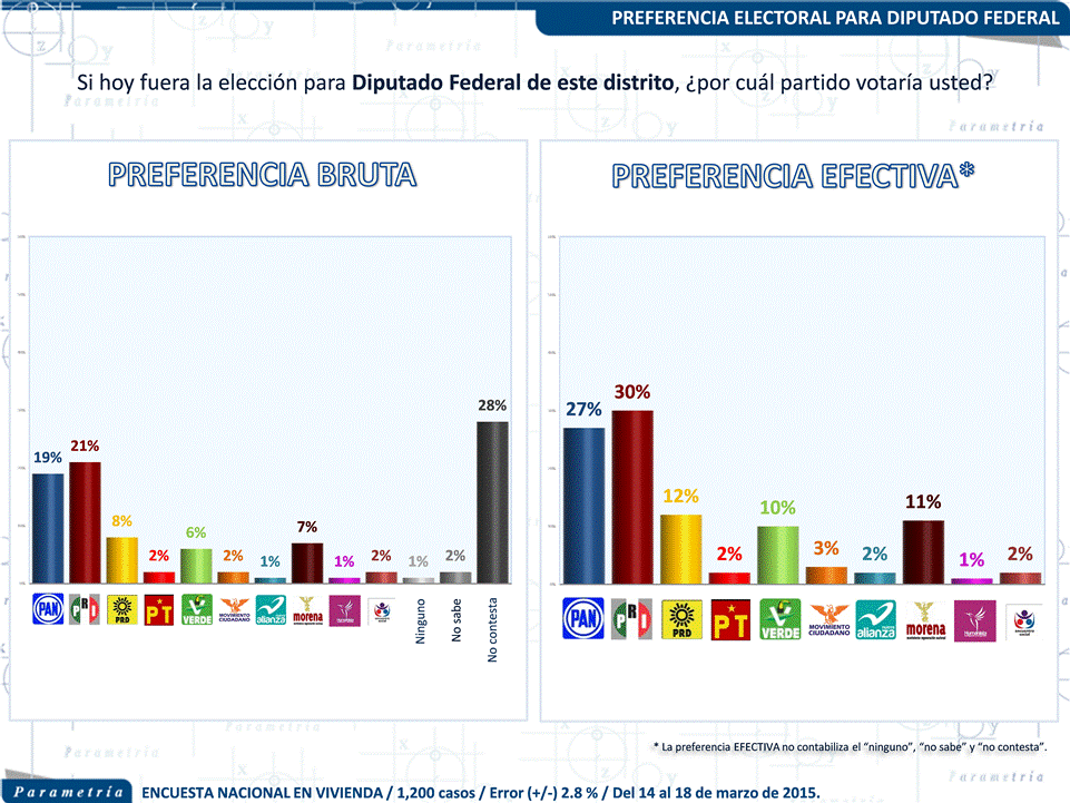 PARAMETRÍA. Encuesta Nacional en vivienda. Representatividad: Nacional. Número de entrevistas: 1,200 cuestionarios hechos a personas de 18 años en adelante con credencial para votar que residan en el lugar de interés al momento de la entrevista. Fecha de levantamiento: del 14 al 18 de marzo de 2015. Tasa de Rechazo: 35 %. Nivel de confianza estadística: 95 %. Margen de error: (+/-) 2.8 %. Diseño, muestreo, operativo de campo y análisis: Parametría SA de CV. Método de muestreo: Aleatorio sistemático con probabilidad proporcional al tamaño. Unidad de muestreo: Las secciones electorales reportadas por el INE. Patrocinador: Parametría SA de CV