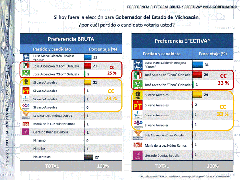 NOTA METODOLÓGICA: PARAMETRÍA. Encuesta en vivienda. Representatividad: Estatal. Número de entrevistas: 1,000 cuestionarios hechos a personas de 18 años en adelante con credencial para votar que residan en el lugar de interés al momento de la entrevista. Fecha de levantamiento: 18 y 19 de abril de 2015. Tasa de Rechazo: 20 %. Nivel de confianza estadística: 95 %. Margen de error: (+/-) 3.1 %. Diseño, muestreo, operativo de campo y análisis: Parametría SA de CV. Método de muestreo: Aleatorio sistemático con probabilidad proporcional al tamaño. Unidad de muestreo: Las secciones electorales reportadas por el INE.