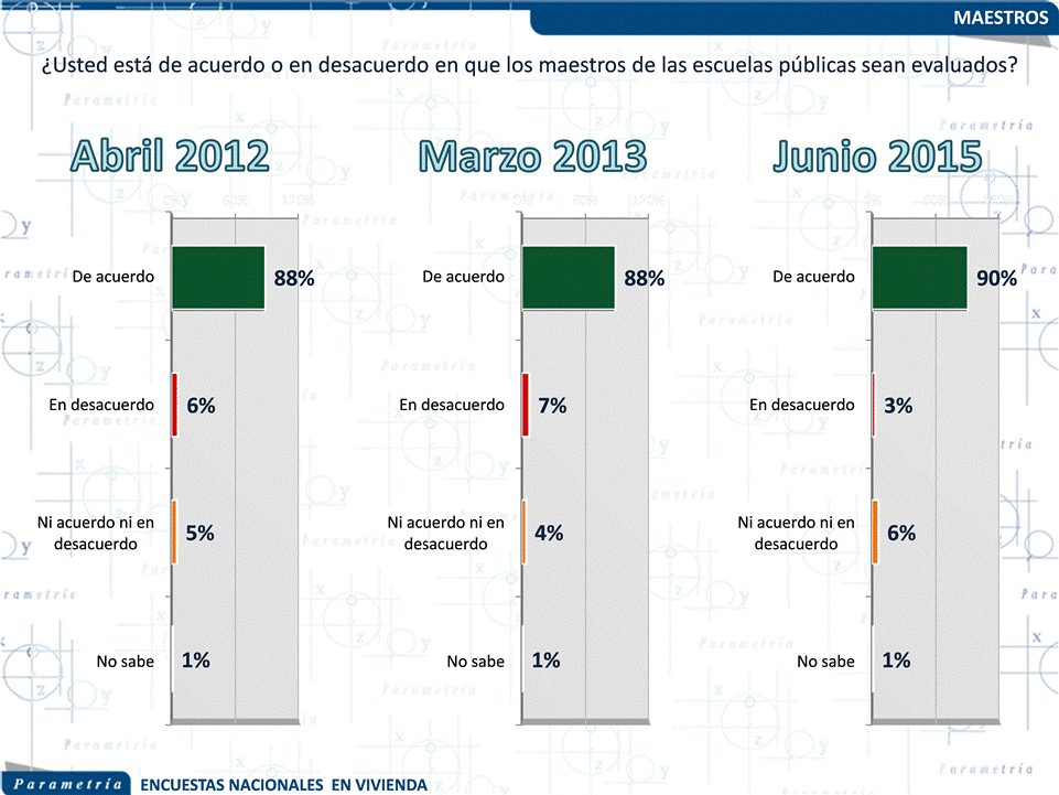 En el tema de la evaluación educativa, la opinión pública en el país respalda que los maestros de las escuelas públicas sean evaluados. De acuerdo con la más reciente encuesta nacional en vivienda realizada por Parametría, nueve de cada diez entrevistados están a favor de la medida. Si revisamos las mediciones anteriores que ha realizado Parametría sobre el mismo tópico, podemos observar que desde la primera vez que lo medimos, en abril de hace tres años, existe un amplio respaldo de la sociedad para que los profesores de las escuelas públicas del país se sometan a evaluaciones.