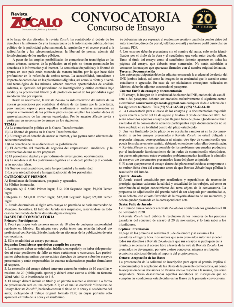 Los anteriores requisitos deberán enviarse al correo electrónico: concursoensayozocalo@gmail.com