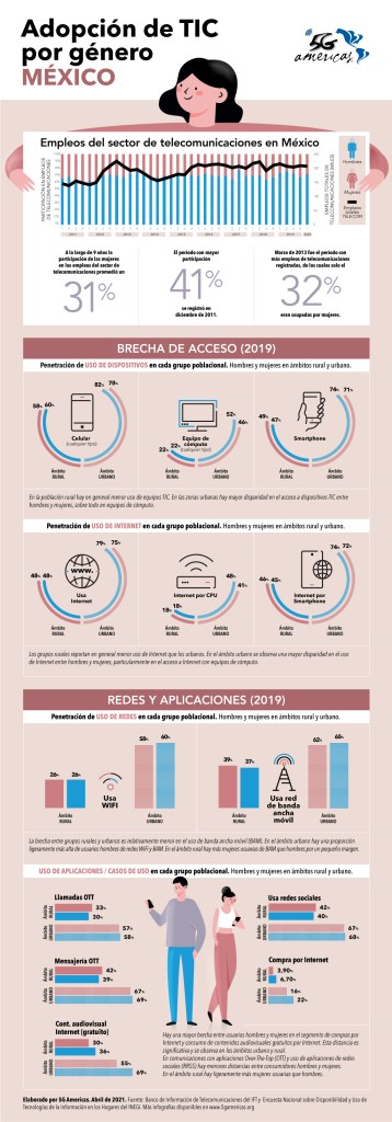 | BUENOS AIRES, 20 de abril de 2021.- En México, los dispositivos y redes de telecomunicaciones móviles han contribuido a aumentar el acceso a las tecnologías de información y comunicación (TIC) de la población en general, pero persisten brechas digitales de género y geografía, junto con una baja participación de mujeres en los empleos del sector de telecomunicaciones. Según las estadísticas con perspectiva de género recopiladas en el Banco de Información de Telecomunicaciones por el Instituto Federal de Telecomunicaciones (IFT)*, para 2019 la brecha de acceso más marcada se observó en el uso de equipos de cómputo entre hombres y mujeres de las zonas urbanas. En el segmento urbano, más del 50 por ciento de la población de hombres reportó utilizar una computadora de algún tipo, mientras que en la población de mujeres esa proporción fue inferior al 50 por ciento. En el ámbito rural, la penetración del uso de computadoras tuvo el mismo nivel entre mujeres y hombres, pero el alcance de estos dispositivos fue de menos de 25 por ciento de cada grupo poblacional. Las proporciones de acceso reportado a dispositivos móviles entre mujeres y hombres son similares, aunque tienen una mayor penetración general en las zonas urbanas. En las poblaciones rurales, la proporción de usuarios que utiliza el smartphone como medio de acceso a Internet ronda el 45% en mujeres y hombres, mientras que en el ámbito urbano esa proporción es ligeramente superior al 70% en ambos grupos. En el uso de redes, las estadísticas con perspectiva de género recopiladas por el IFT muestran en general hay paridad en el uso de redes WiFi y de banda ancha móvil. En el ámbito rural, la banda ancha móvil tiene una penetración más alta que el WiFi en general. Para el caso de aplicaciones, las cifras revelan menores diferencias en el uso de redes sociales y aplicaciones para comunicaciones over-the-top (OTT) entre mujeres y hombres de las zonas rurales y urbanas. Sin embargo, en las compras por Internet y el consumo de contenido audiovisual gratuito existe una brecha más marcada con una mayor frecuencia de usuarios hombres. Las cifras de empleo en el sector de las telecomunicaciones del IFT muestran que en casi una década (enero de 2011 a enero de 2020), el promedio de participación de las mujeres en el segmento de las telecomunicaciones se mantuvo en un 31 por ciento, siendo diciembre de 2011 cuando se alcanzó el nivel de más alto de participación de aproximadamente 41 por ciento. *El Banco de Información de Telecomunicaciones está disponible para su consulta en https://bit.ift.org.mx/ |