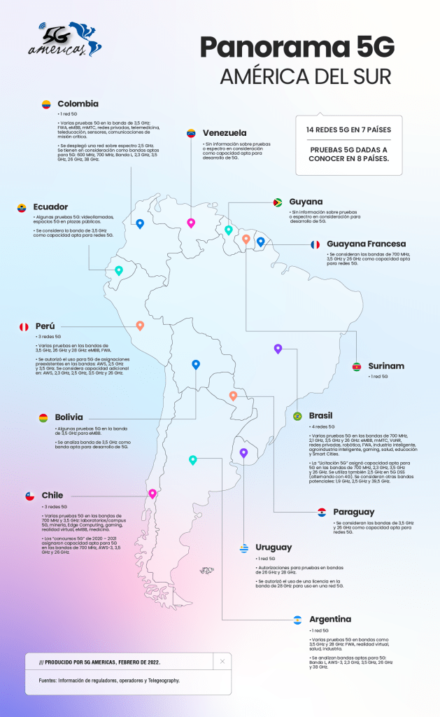 | BUENOS AIRES, 24 de febrero de 2022.- El desarrollo de redes 5G continuó en la región de América del Sur y en febrero de 2022 ya existían 14 redes 5G operativas en siete países de la región, según un relevamiento de 5G Americas con base en información de agencias reguladoras, operadores y Telegeography. Las redes se han desplegado en bandas de frecuencia que se han licenciado por medio de procesos licitatorios recientes (Chile y Brasil entre 2020 y 2021), pero también existen casos en los que los gobiernos autorizaron cambios a licencias preexistentes de espectro para permitir nuevos servicios inalámbricos (Perú y Uruguay). Dado que el desarrollo de 5G coexiste con la operación de redes 4G y anteriores, es crucial que las administraciones nacionales identifiquen bandas de frecuencia aptas para el desarrollo de estas nuevas redes. En términos generales, los países de América del Sur consideran espectro de las bandas de 3,5 GHz y 26 GHz como bandas de espectro para el desarrollo de 5G, pero en la planeación del uso del espectro se distinguen otros rangos, como 600 MHz, 700 MHz, la Banda L, 2,3 GHz, 2,5 GHz y 28 GHz, dependiendo del país. Fabricantes de tecnología y operadores de red han realizado una variedad de pruebas 5G en América del Sur para demostrar nuevos casos de uso que abarcan: teleducación, telemedicina, redes privadas para uso industrial, comunicaciones multimedia en tiempo real, gaming, ciudades inteligentes y realidad virtual. |
